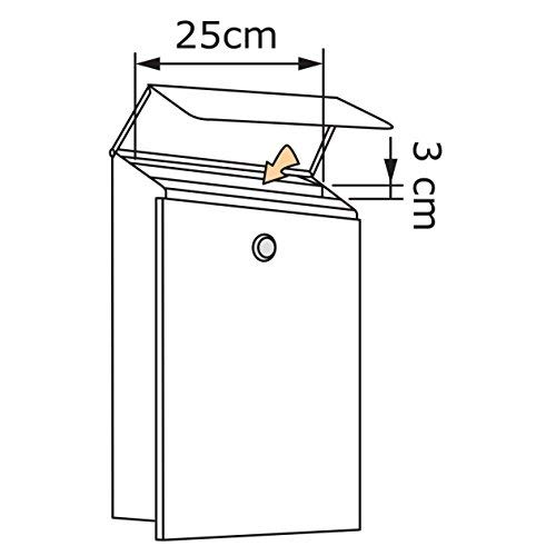 Afmetingen brievenbus: breedte: 25,5 cm, hoogte: 37,5 cm, diepte: 9,5 cm; inworpgleuf: lengte: 25 cm, breedte: 3 cm