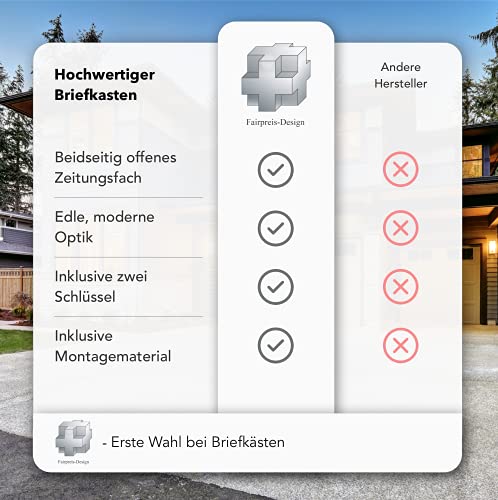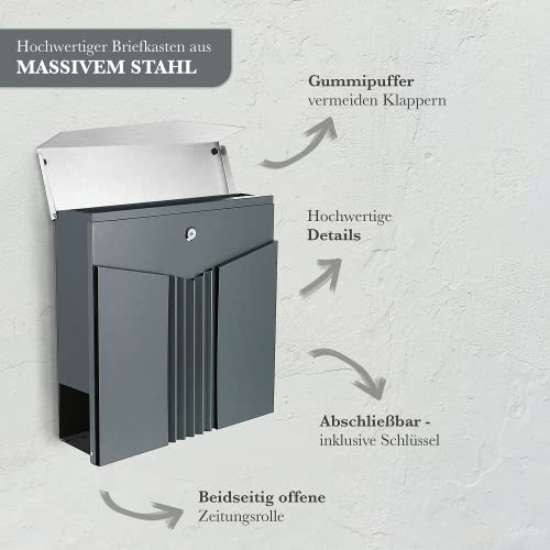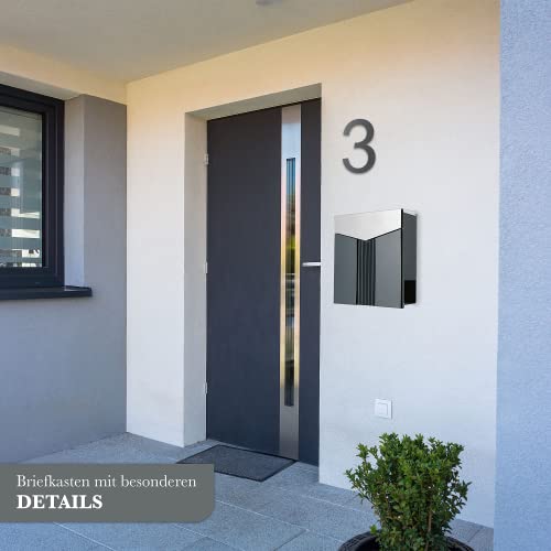 Hoogwaardige productie: onze designbrievenbussen zijn gemaakt van roestvrij staal 18/0 met beschermende lak tegen roest, evenals van massief gepoedercoat plaatstaal in de kleur antraciet-grijs, zijn weerbestendig en hebben een zeer goede roestbestendigheid en een lange levensduur.