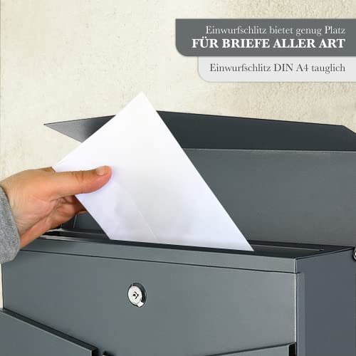 Grote capaciteit: afmetingen (b x h x d): ca. 37 x 37 x 10,5 cm. Door de extra grote gleuf en praktische krantenrol kunnen onze brievenbussen probleemloos brieven, kranten, tijdschriften of DIN A4-formaten zonder knikken opnemen.