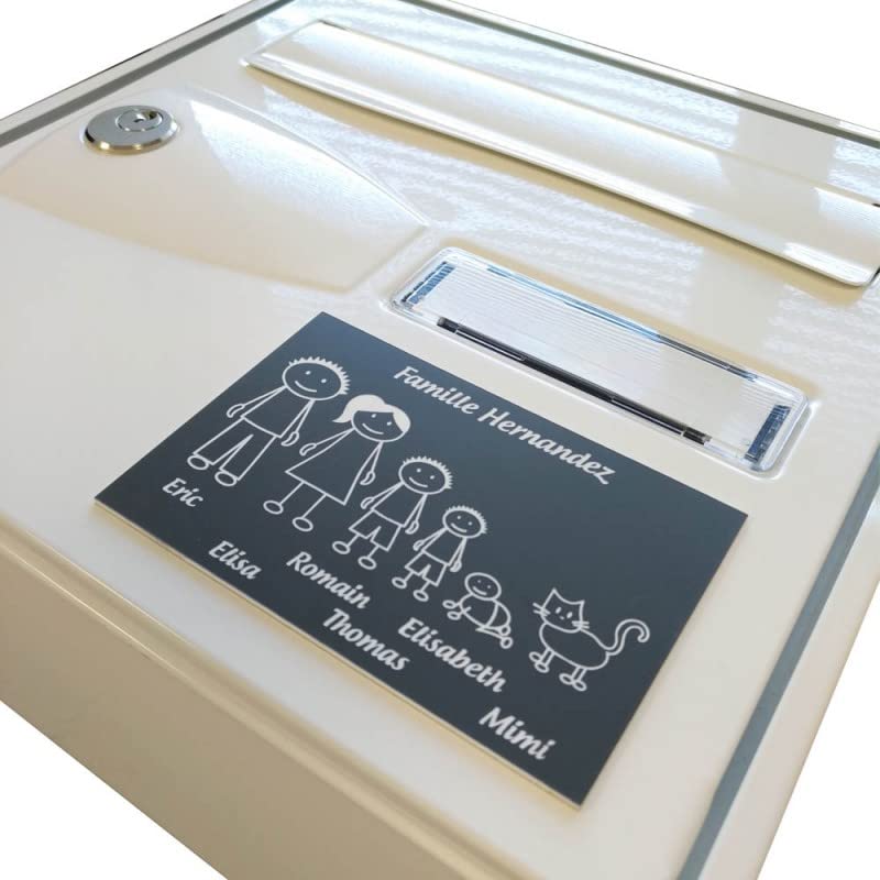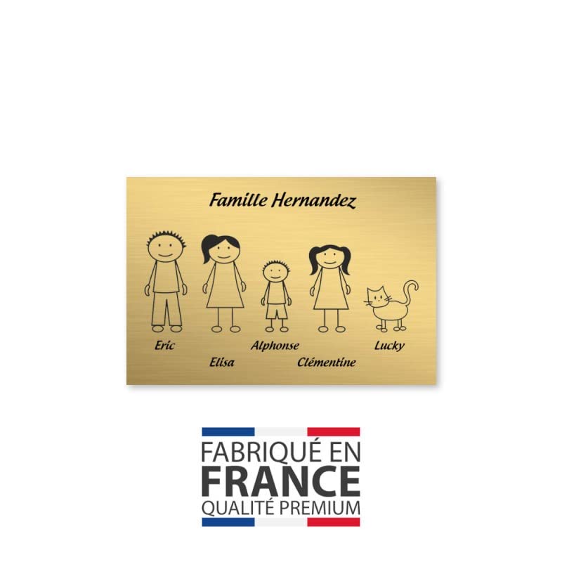 Maak eenvoudig en snel je persoonlijke bord met 5 familieportretten. Je hebt de mogelijkheid om de familieleden te kiezen (papa, mma, tiener, kinderen, baby, animal). Dit personaliseerbare bord in goud met zwarte letters kan aan de voorkant van een brievenbus worden bevestigd. Het materiaal is perfect geschikt voor gebruik buitenshuis. Het bord heeft een dikte van 1,6 mm en is gemaakt van kunststof. De kleuren van deze brievenbusborden vervagen niet en vervagen niet in de tijd. Het materiaal is waterbestendig, uv-bestendig. Dit personaliseerbare brievenbusbord Family is verkrijgbaar in 25 kleuren. Het bord wordt door lasergravure met de karakters en de naam van de familieleden die je wilt selecteren. Door het hoogwaardige 3M-plakband kan het gepersonaliseerde bord met de Family snel aan de voorkant van je brievenbus op de gewenste plaats worden bevestigd.