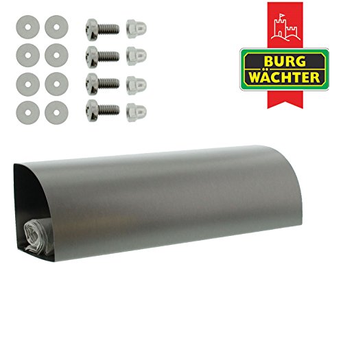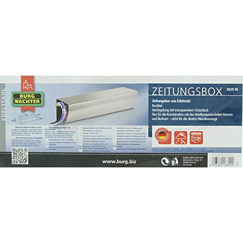 Krantenbox voor buiten: Voor bevestiging onder of op een brievenbus – mooi design, aan beide zijden bruikbaar, combinatie met een eenheid: brievenbus-modellen Amrum en Borkum – Eenvoudige montage: afstandhouders ter bescherming van de huismuur en compensatie van oneffenheden – Made in Germany – 5 jaar fabrieksgarantie, extreem weerbestendig: hoogwaardige en roestvrije roestvrij stalen verwerking, verzegeling met transparante beschermende lak – Levering: 1 Burg-Wächter Roestvrijstalen krantenbox, 3820 Ni, 18820, Incl. Bevestigingsmateriaal en 2 plakstrips, Afmetingen (BxDxH): 362 x 102 x 102 mm, Materiaal: Roestvrij staal