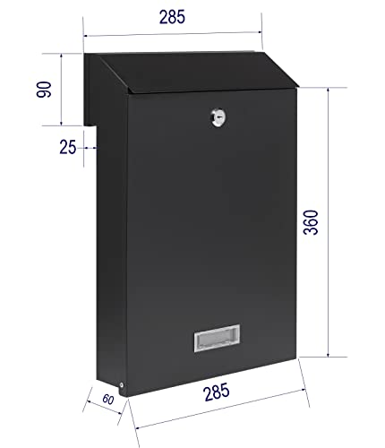 De brievenbus is 410 mm hoog en 285 mm breed – Afmetingen: frontplaat: 90 x 285 mm (HxB) / inworp: 30 x 245 mm (HxB) / deurmaat: 360 x 285 mm (HxB) / diepte van de brievenbus: in hoogte van het frontpaneel – 90 mm; onder – 60 mm