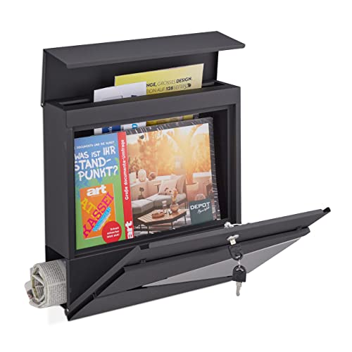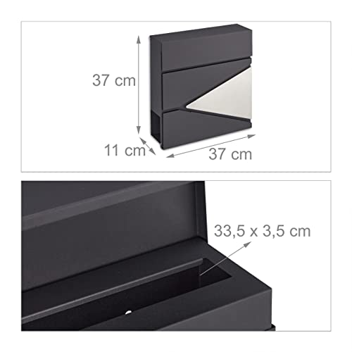 Relaxdays Brievenbus met krantenvak, modern, afsluitbaar, brievenbus h x b x d: 37 x 37 x 11 cm, staal, zwart/zilver